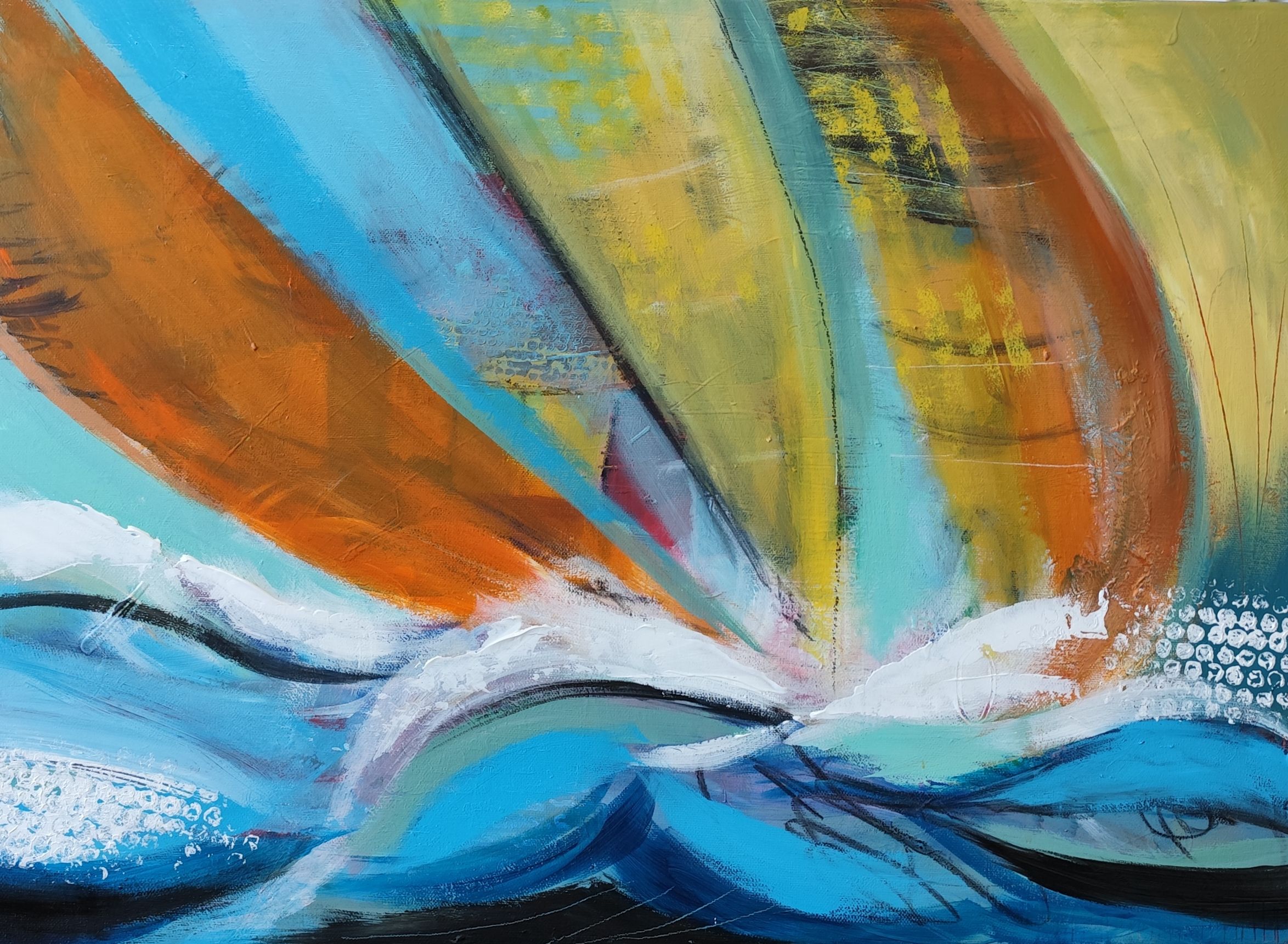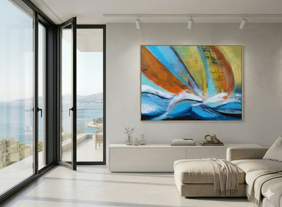 “Pozdrav iz Rovinja”, apstraktna slika jedrilica, 50×70 cm,akril na platnu